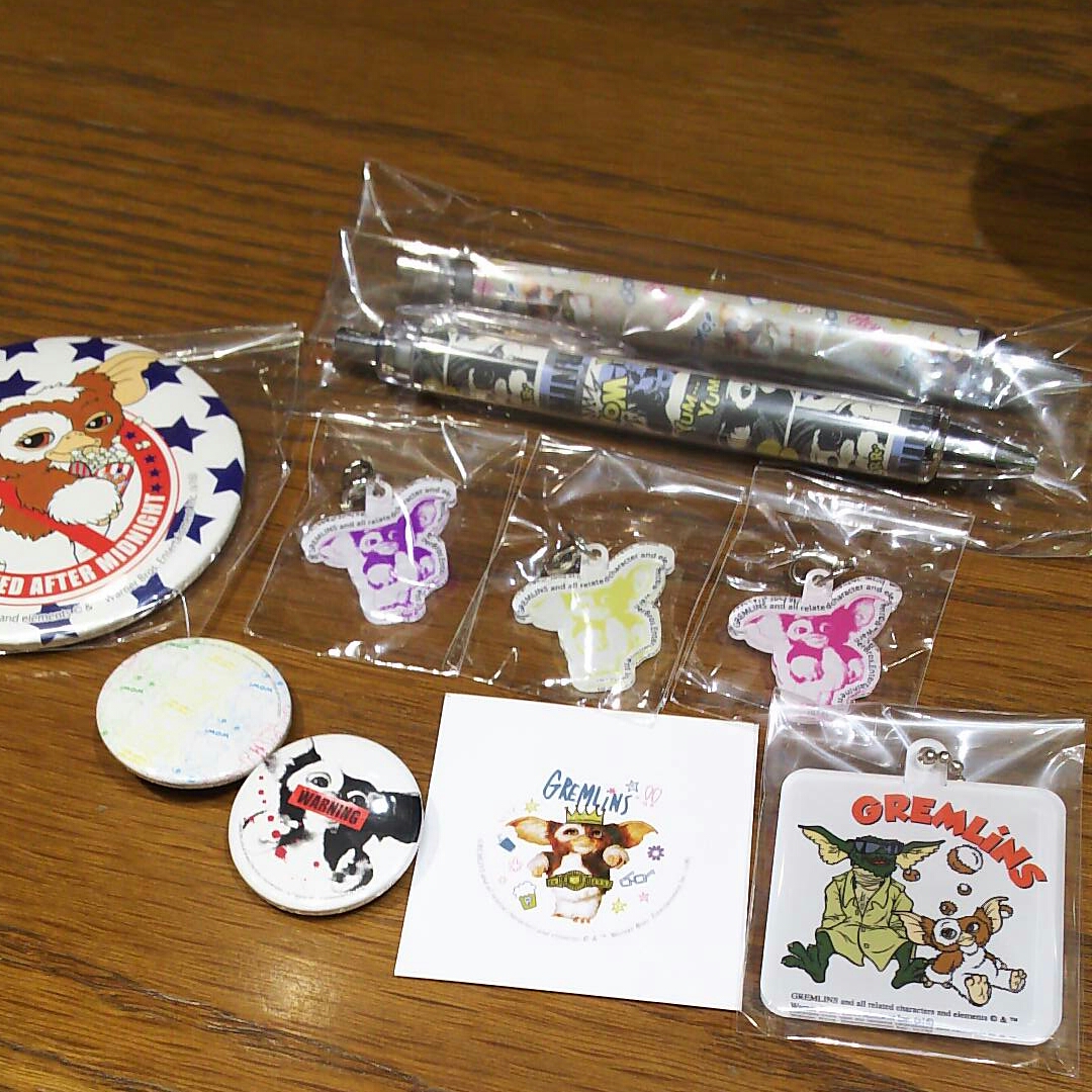 ステッカーは二種類柄があってもうひとつはミラーのポップコーン持ってるギズモ。手前右のキーホルダーがB賞。