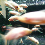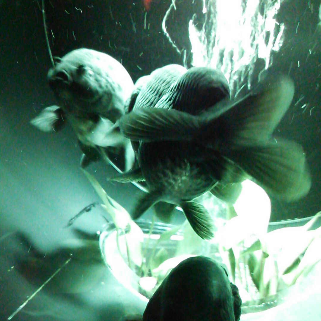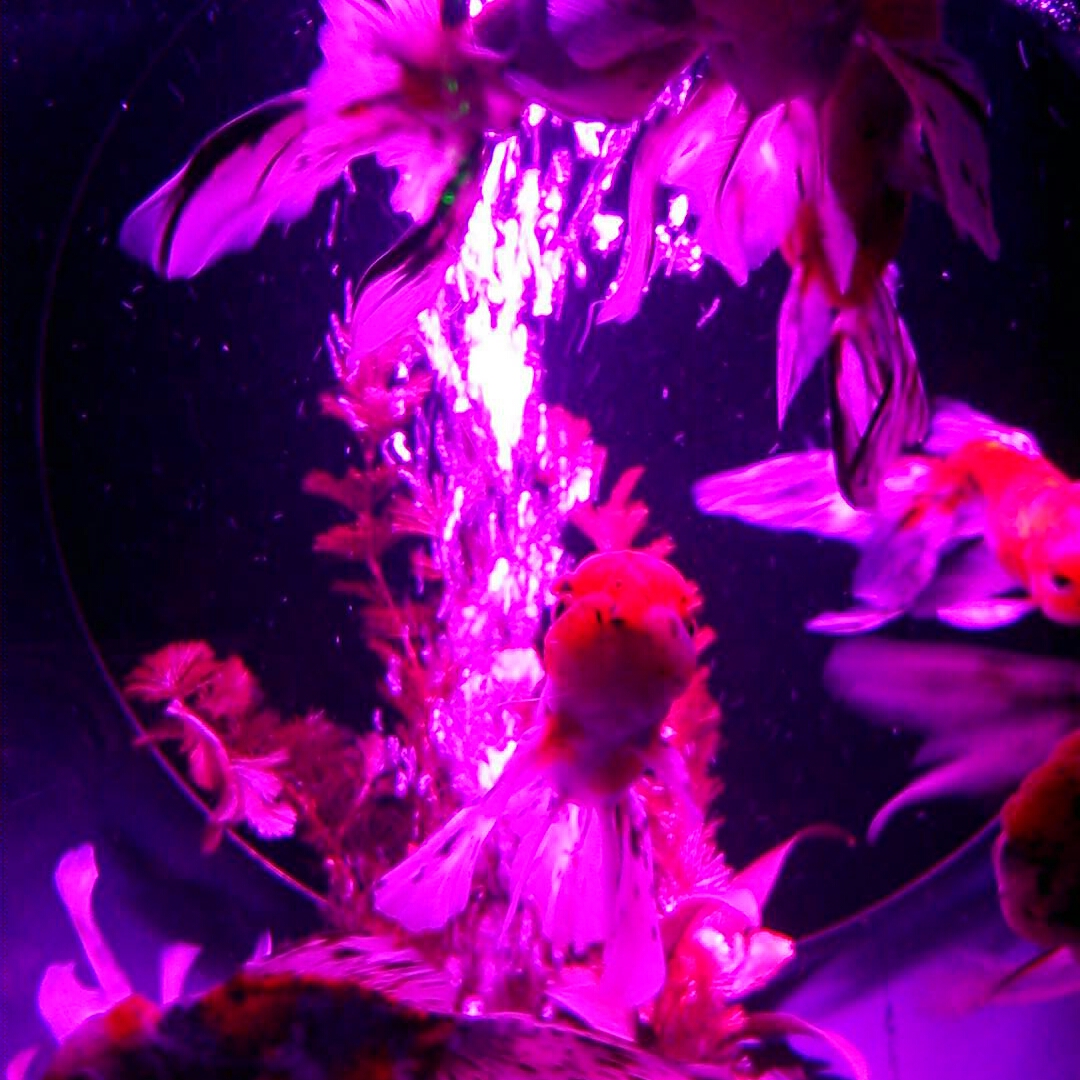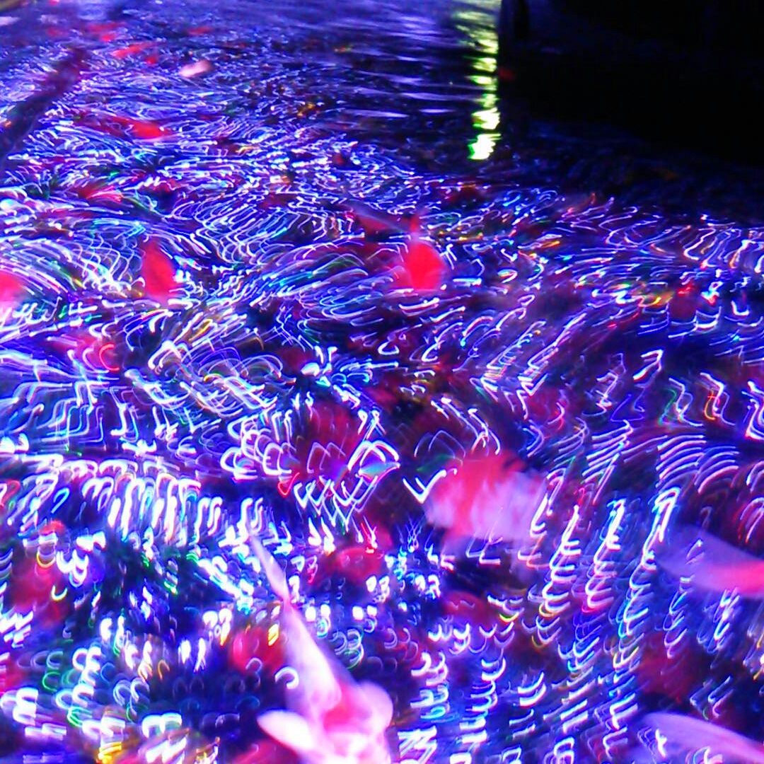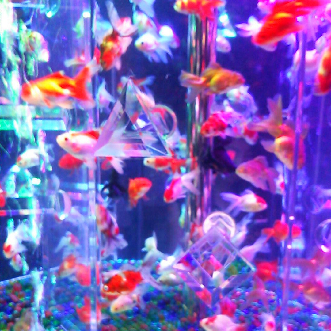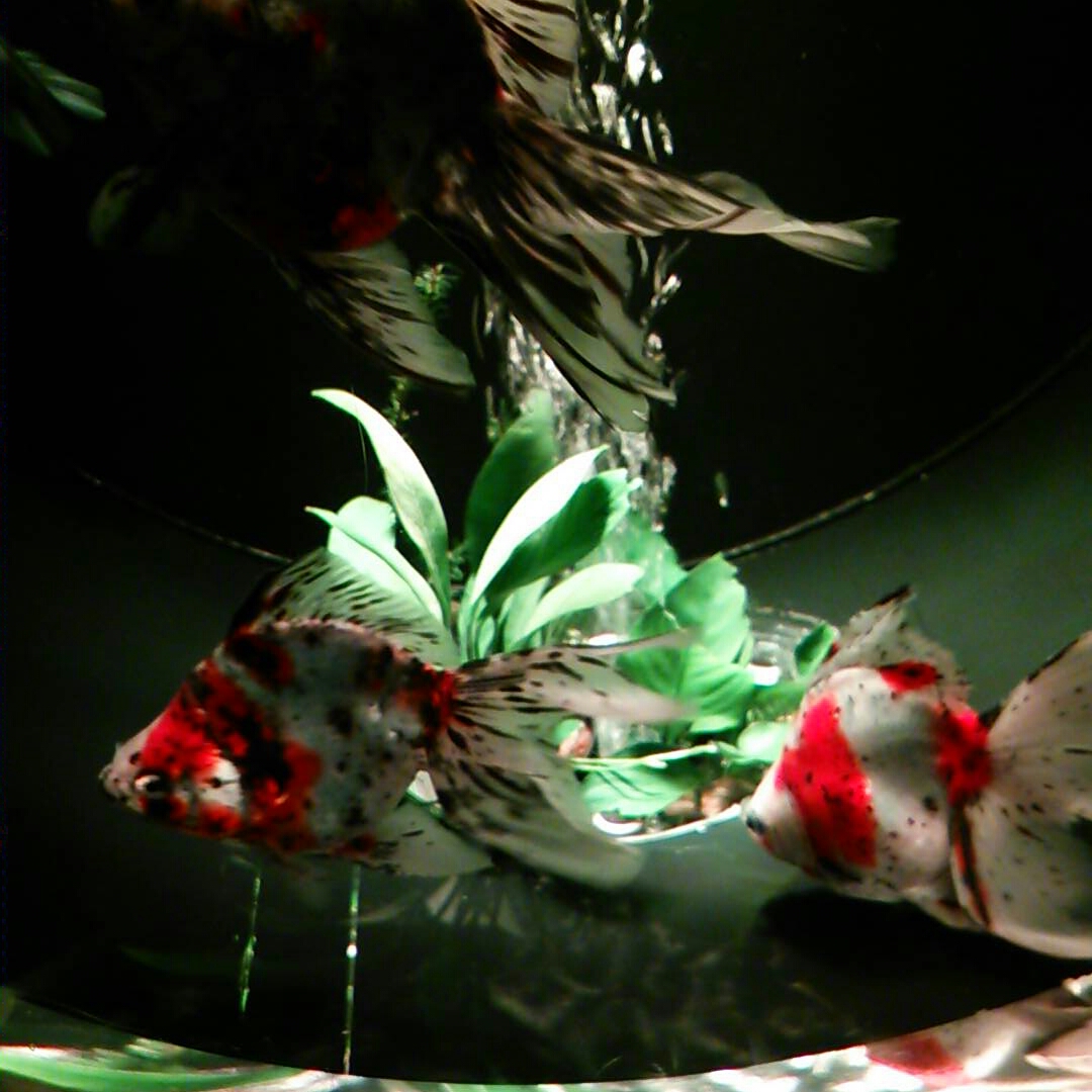 下の水槽にももちろん金魚。水面がゆらめいているので上から撮ると勝手に右の写真みたいになります。“首都高”と藤九郎が命名。