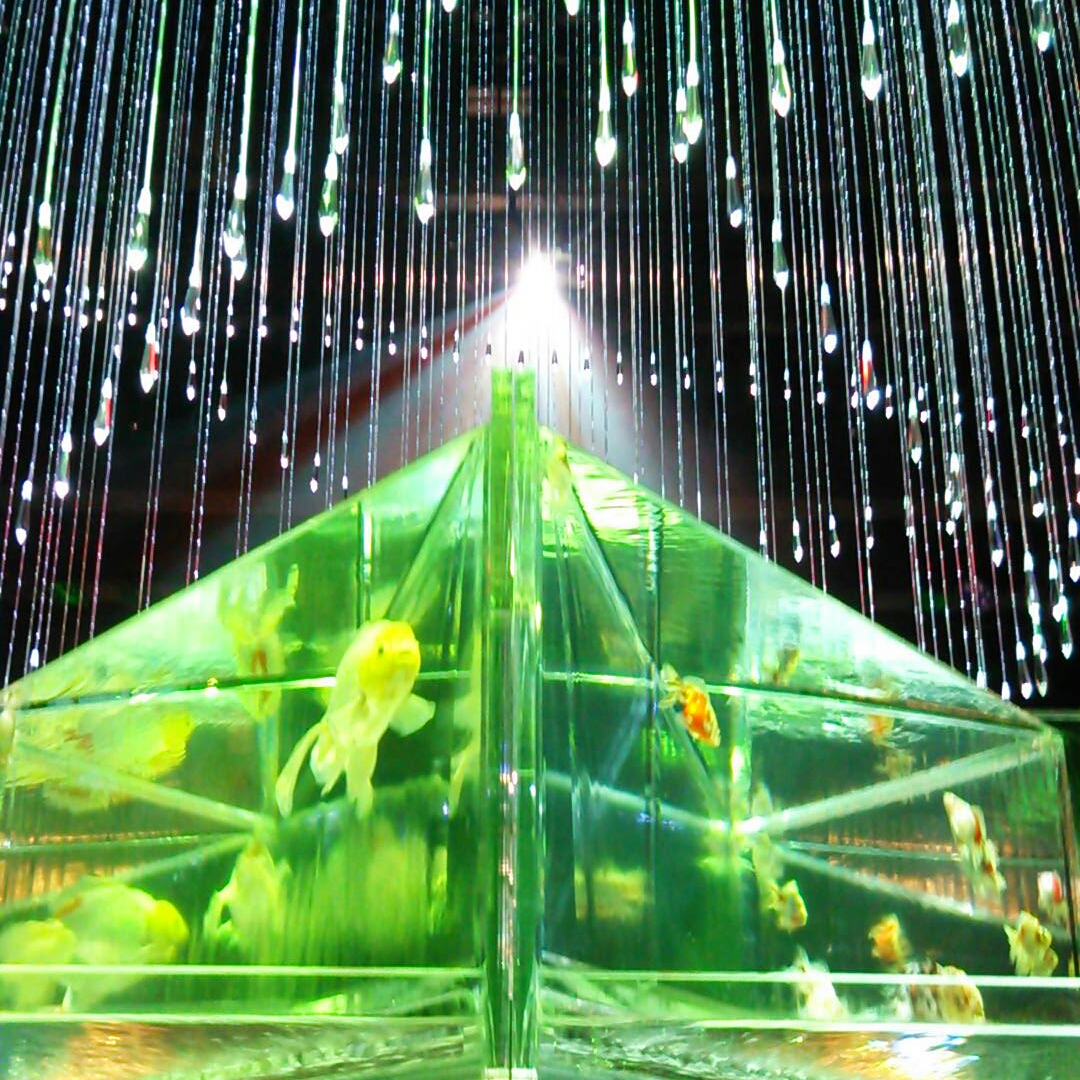 まず入り口に水槽。三角や四角の窓から覗くと万華鏡みたいになってます。