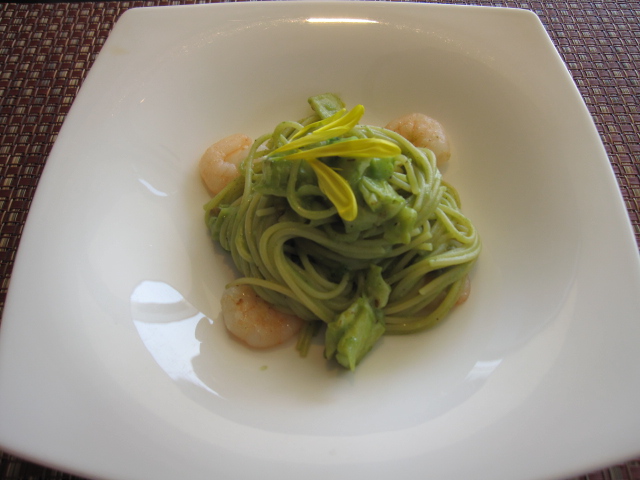 メインはブロッコリーと海老のパスタ。色がキレー。